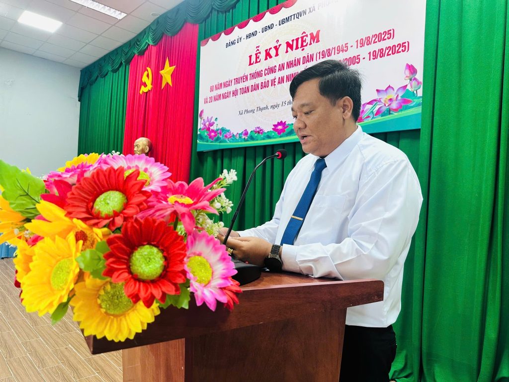 Chiều ngày 15/8/2025, Đảng ủy – Hội đồng nhân dân – Ủy ban nhân dân – Ủy ban Mặt trận Tổ quốc Việt Nam xã Phong Thạnh tổ chức Lễ kỷ niệm 80 năm Ngày truyền thống Công an nhân dân Việt Nam (19/8/1945-19/8/2025) và 20 năm Ngày hội toàn dân bảo vệ an ninh Tổ quốc (19/8/2005-19/8/2025).